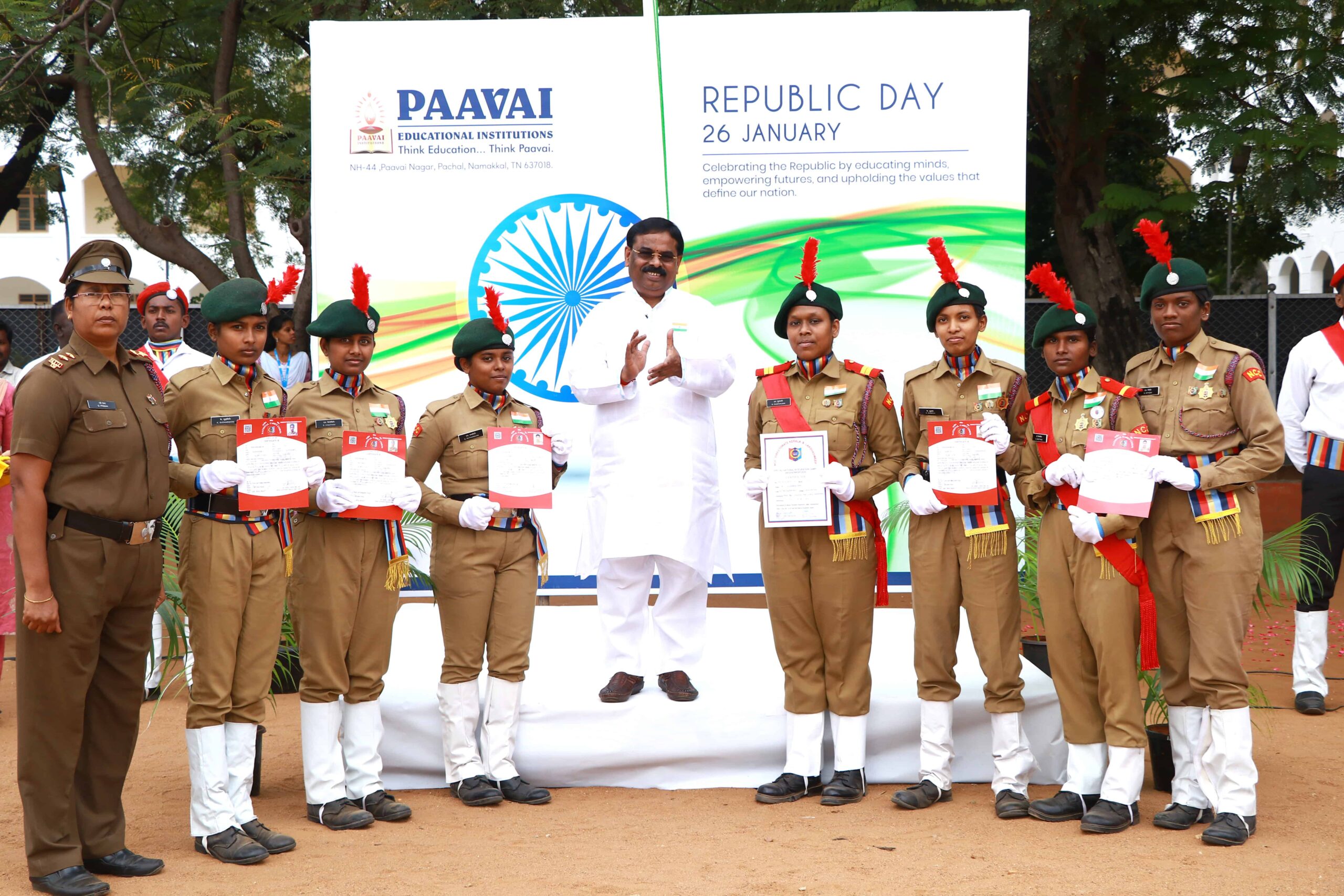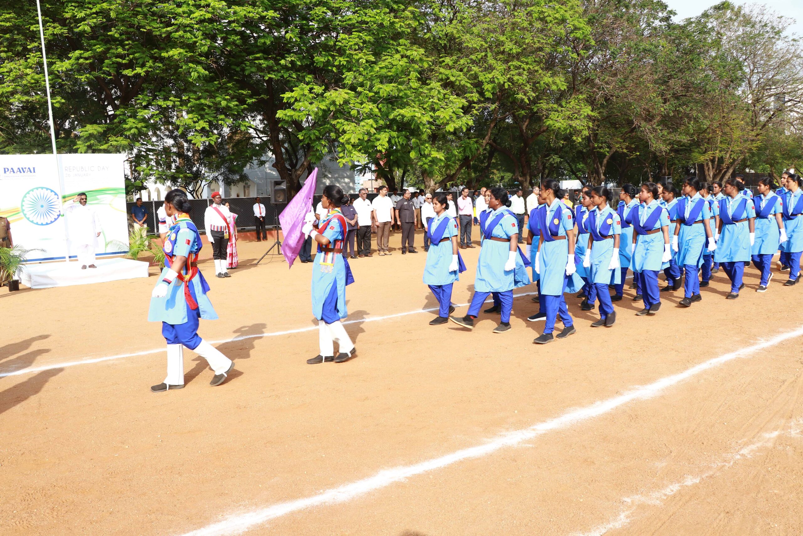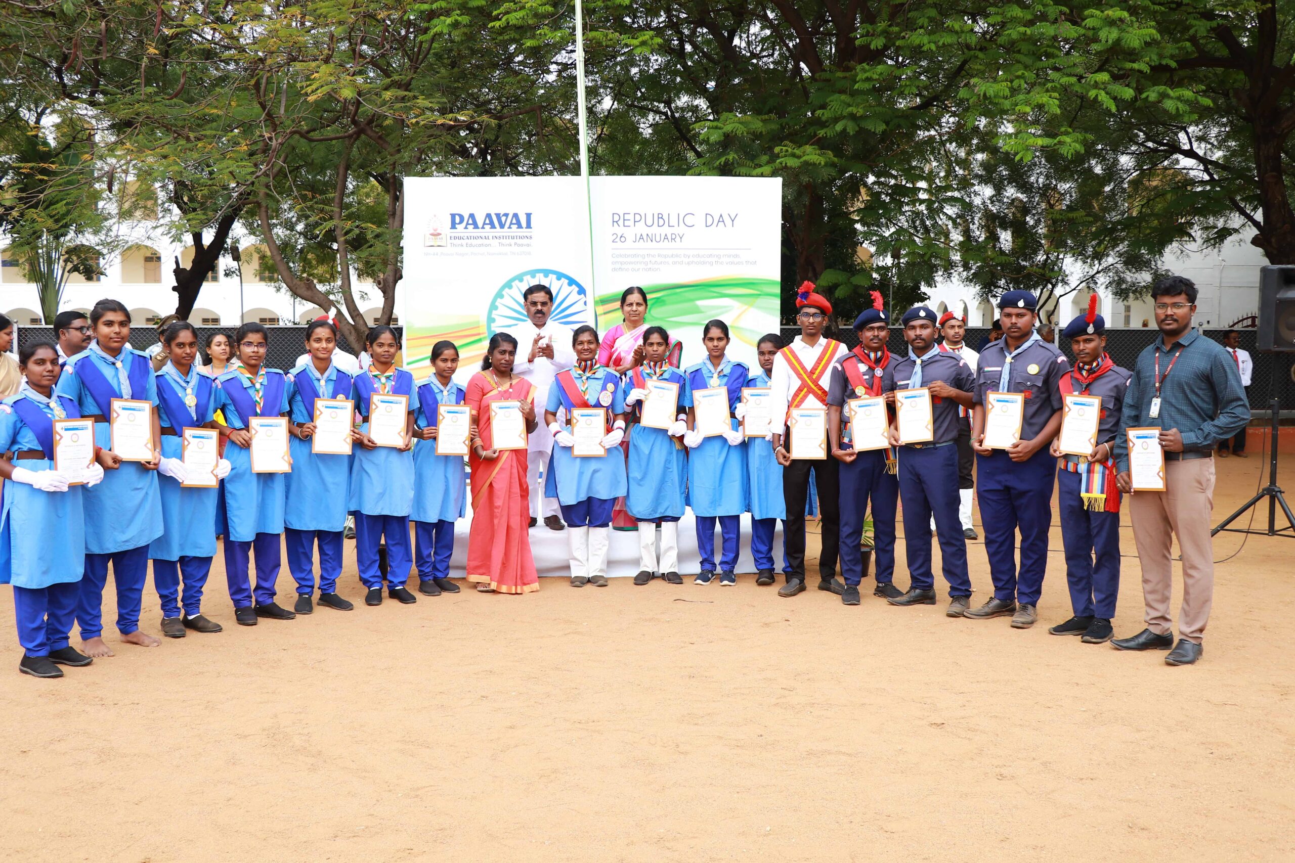 Paavai Educational Institutions celebrated the 77th Republic Day at Kalpana Chawla Open Theatre with great pride and patriotic spirit. The programme commenced with Tamil Thai Vazhthu. The celebration was presided over by Shri. CA. N.V. Natarajan, Founder and Chairman, Paavai Institutions. He hoisted the National Flag and delivered the Republic Day address.