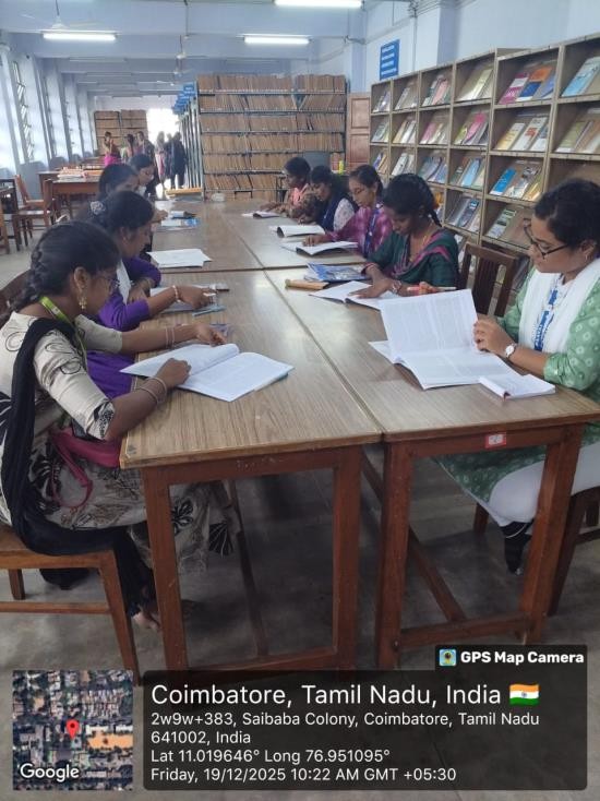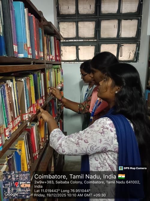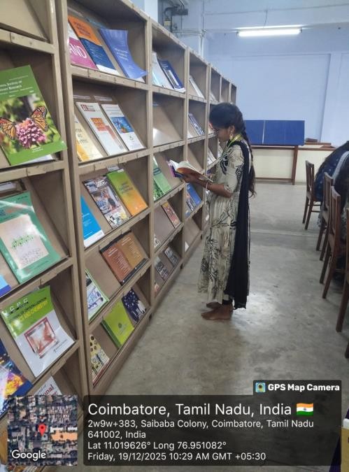 Mrs. Geetha, a faculty member from Avinashilingam University, guided the students through the library. She explained the library’s organizational structure, book classification system, and effective methods of utilizing various resources. Her detailed explanation helped students gain practical knowledge on navigating and making optimal use of an academic library. This exposure proved to be both informative and highly beneficial.