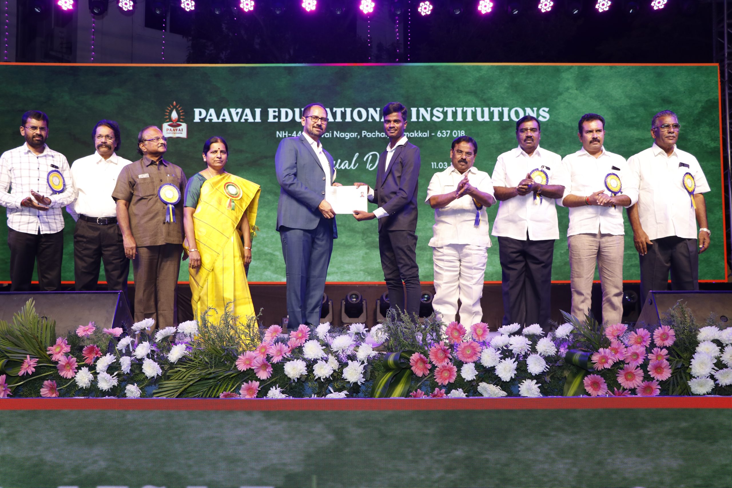 Forty-five variegated cultural events were performed by the students that ornamented the annual day and it was indeed a professional show that captivated the eyes of many. The best outgoing students of various departments of all Paavai Institutions were awarded. The Vote of thanks was proposed by Smt.Mangai Natarajan, Correspondent, Paavai Institutions. The Vice-Chairman, Secretary, Treasurer, Joint Secretary, Directors of Paavai Institutions, Deans, Principals, Special invites, Professors, parents, and students graced the occasion.