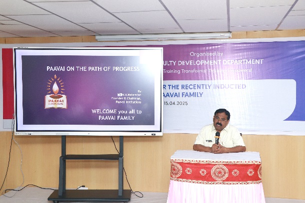 The Faculty Development Department organized a Six Day Induction Programme for the recently recruited faculty members to make them familiar with the institutional practices and the instructional strategies of teaching and learning, because teachers are considered to be the pillars of Paavai. The inaugural ceremony was held at Premium Hall on 04.04.2025. The programme started invoking God’s bountiful blessings with the prayer song, followed by lighting of the kuthuvilakku. Shri. CA N.V. Natarajan, Chairman of Paavai Educational Institutions, delivered the Inaugural Address, emphasizing the pivotal role of teachers as exemplary role models who create an active and engaging learning environment within the classrooms. Sir underscored the significance of the 5C’s—Compliance, Collaboration, Clarification, Culture, and Continuous Feedback—as essential pillars for the professional and academic development of faculty members. Sir also, highlighted the important role of value-based education in shaping the holistic development of students. Correspondent Madam, felicitated the gathering and in her address remarked on the distinct and innovative pedagogical approaches adopted at Paavai. She advocated for a shift from content-based to concept-based education, urging faculty members to embrace this transformative methodology. Additionally, she emphasized the importance of the precise and purposeful use of technical terminology in the teaching-learning process to enhance clarity and understanding. Dr.K.Selvi Dean Academics, PEC welcomed the gathering. The objectives and methodology of the induction programme were spelled out by Dr.J.Murshitha Banu Head, FDD. 31 faculty members from Paavai Educational Institutions attended the Induction Programme.
