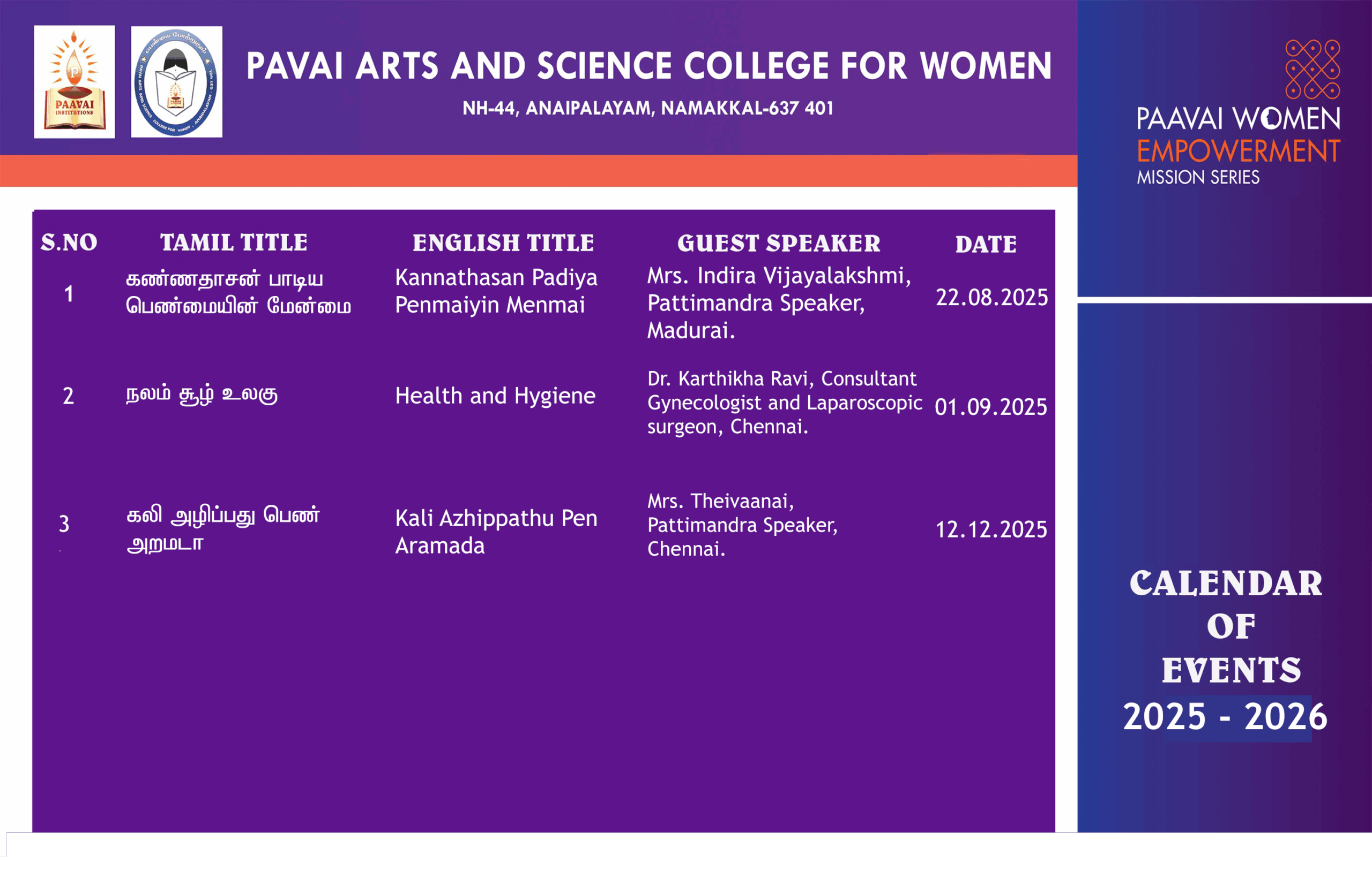 - In the Paavai Mission on Women Empowerment Series,a special address on “Kavalan SOS Mobile App – Namkaaval Mobile APP” was conducted in Anandha Arangam at 10.00 a.m.