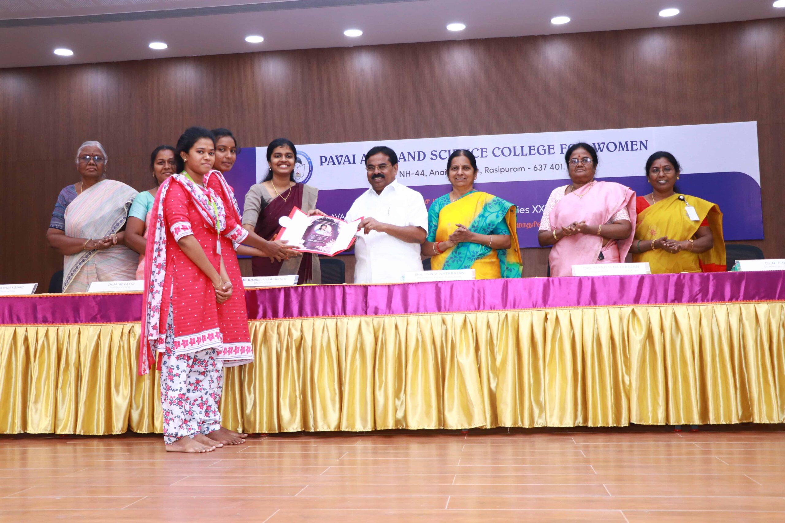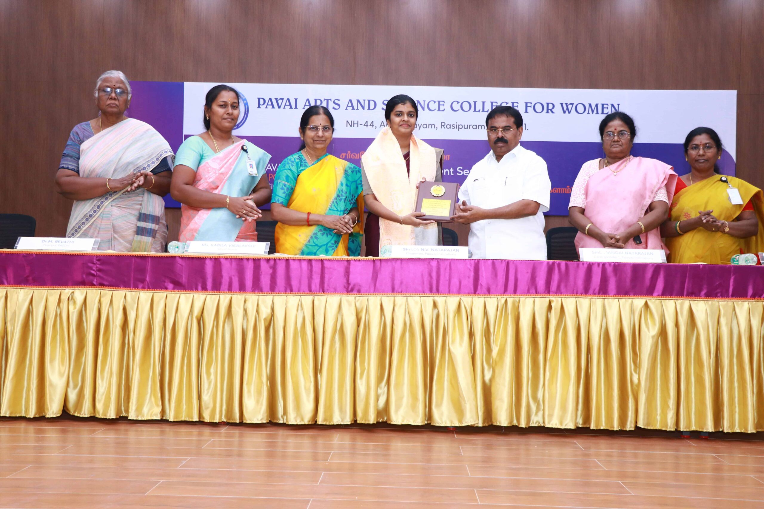 Shri CA. N. V. Natarajan, Chairman and Founder of Paavai Educational Institutions, along with Smt. Mangai Natarajan, Correspondent of Paavai Educational Institutions, honoured the Chief Guest, Mrs. Kabila Visalatchi, Public Speaker from Trichy, with a shawl and memento. The Chairman delivered the Presidential Address and presided over the function.